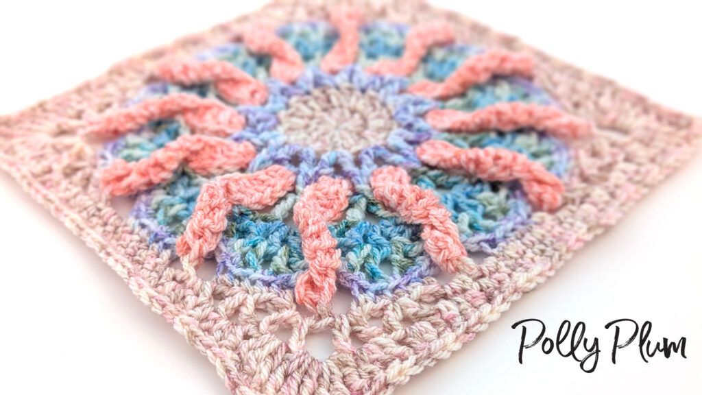 With new yarn: Begin in front of r4 between any two ‘sizzles’ with a standing fpdc2tog working the first leg around the second dc of the r3 V aligned with the ‘sizzle’ behind your work and the second leg into the first dc of the r3 V aligned with the ‘sizzle’ ahead of your work.